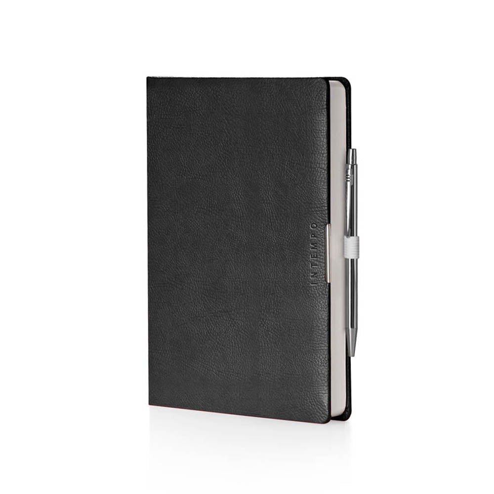 La copertina in similpelle nera, con la sua texture rugosa, conferisce all'Agenda Intempo un aspetto sofisticato e professionale. Questo materiale non solo è piacevole al tatto, ma anche resistente e durevole, proteggendo le 320 pagine interne da eventuali danni. Le dimensioni di 15 x 21 cm la rendono perfetta da portare sempre con te, in borsa o nello zaino, senza ingombrare.