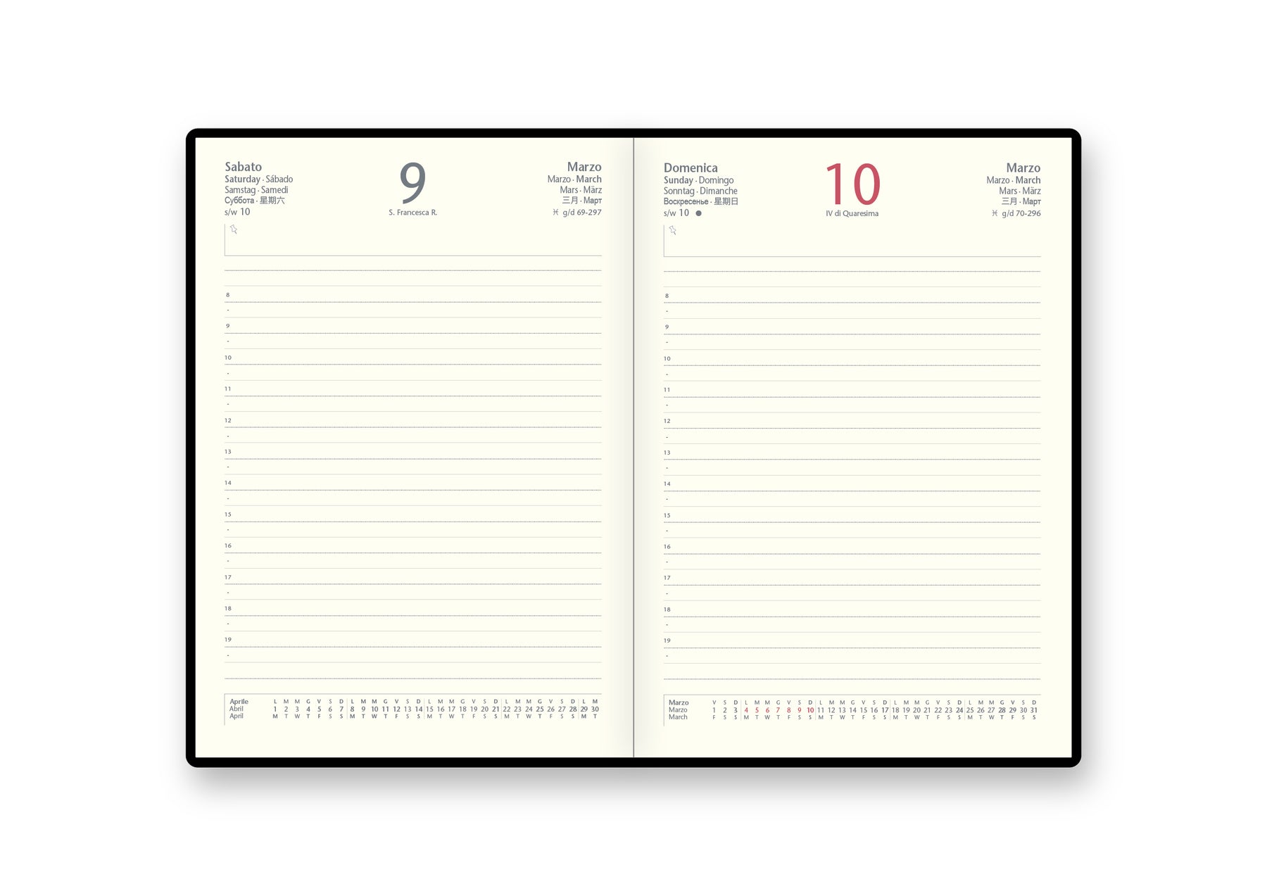 - Pianificazione dettagliata: Una pagina per ogni giorno, inclusi sabato e domenica separati.