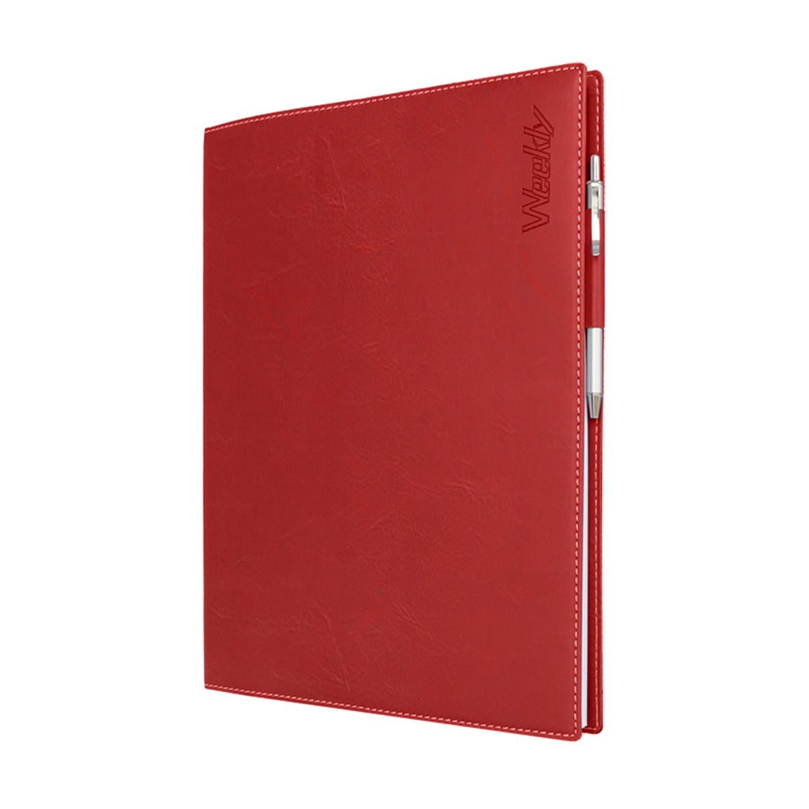 La copertina in similpelle rossa conferisce all'Agenda Intempo un aspetto elegante e professionale. Il materiale sintetico di alta qualità imita la texture della pelle, offrendo una sensazione di lusso e resistenza al tatto. Le cuciture bianche a contrasto esaltano il design, aggiungendo un tocco di classe. Questa agenda professionale non è solo uno strumento di pianificazione, ma anche un accessorio di stile che riflette la tua personalità e il tuo gusto.