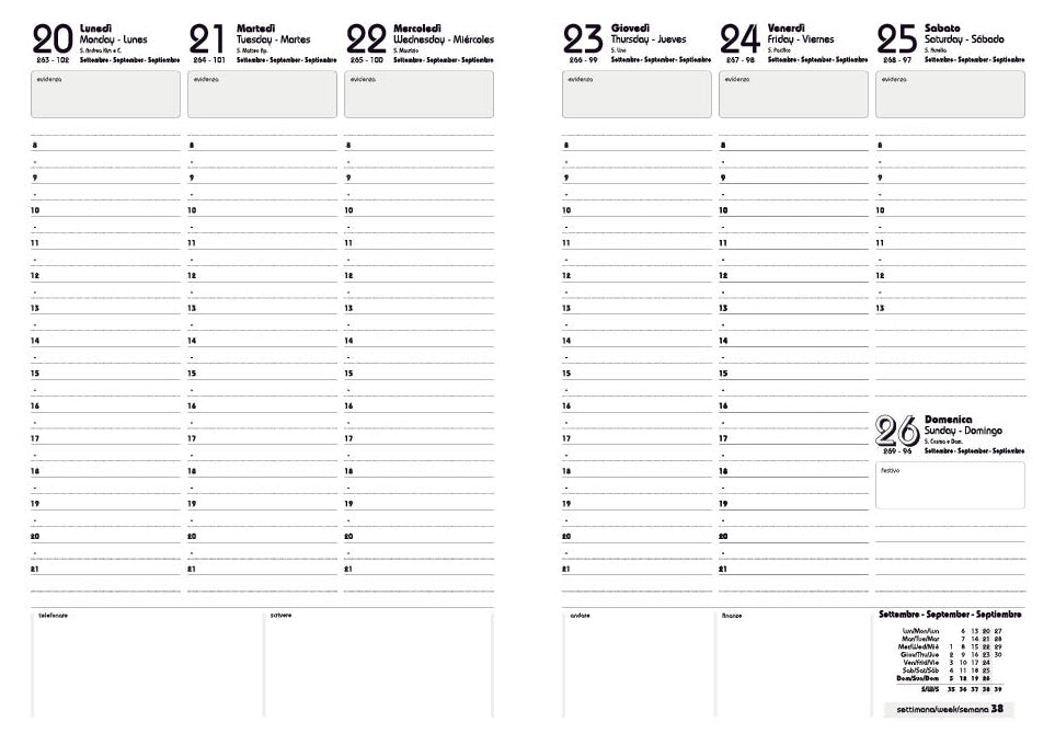 L'interno dell'Agenda Intempo è realizzato con carta bianca di alta qualità, ideale per scrivere con qualsiasi tipo di penna o matita. La superficie liscia e resistente permette di annotare appunti e pianificazioni senza sbavature o trasparenze. La struttura settimanale offre una visione chiara e immediata degli impegni di ogni giorno, facilitando l'organizzazione del tempo e la gestione delle priorità.