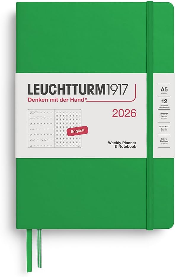 Organizza il tuo 2026 con stile ed efficienza grazie all'Agenda Settimanale Leuchtturm1917 e al Taccuino Medium A5 con pagine a puntini. Questa agenda, con la sua elegante copertina rigida color Spring Leaf, è l'accessorio ideale per chi cerca un equilibrio tra funzionalità e design. Perfetta per studenti, professionisti e creativi, questa agenda ti accompagnerà in ogni momento della tua giornata, aiutandoti a pianificare, organizzare e dare spazio alla tua creatività. Scopri la gioia di avere tutto sotto controllo con un tocco di colore e raffinatezza.