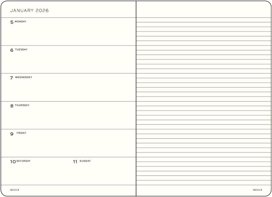 Questa agenda settimanale è pensata per offrire la massima funzionalità in un formato compatto. Le dimensioni Pocket A6 (90 x 150 mm) la rendono facile da trasportare in borsa o nello zaino, senza rinunciare allo spazio necessario per annotare tutti i tuoi impegni. La copertina rigida protegge le pagine interne, mentre l'elastico di chiusura assicura che l'agenda rimanga ben chiusa, evitando che le pagine si pieghino o si danneggino. All'interno, il layout settimanale offre una visione chiara e immediata dei tuoi impegni: sulla pagina di sinistra trovi la settimana completa, mentre sulla pagina di destra hai a disposizione una pagina a righe per appunti, idee e note personali. Questo design intelligente ti permette di organizzare al meglio il tuo tempo e di avere sempre a portata di mano tutto ciò che ti serve.