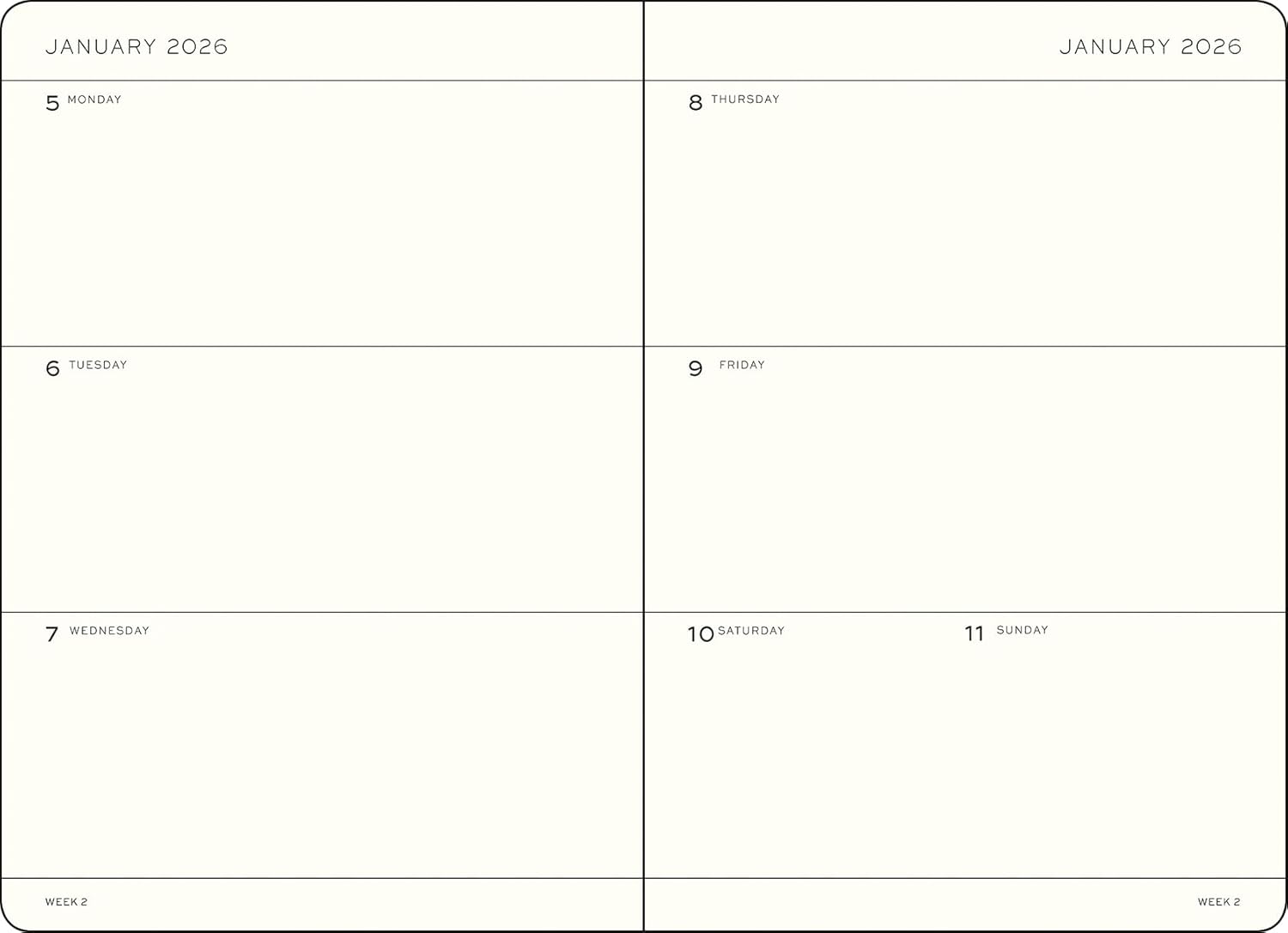 Il layout settimanale orizzontale è uno dei punti di forza di questa agenda. Ogni settimana è visualizzata su una doppia pagina, offrendo una panoramica chiara e immediata dei tuoi impegni. Ogni giorno ha un ampio spazio dedicato, ideale per annotare appuntamenti, promemoria, e attività importanti. Questo formato ti permette di pianificare in dettaglio ogni aspetto della tua settimana, senza sentirti limitato dalla mancanza di spazio. Che tu sia uno studente, un professionista, o semplicemente una persona che ama avere tutto sotto controllo, questa agenda ti fornirà il supporto necessario per raggiungere i tuoi obiettivi.