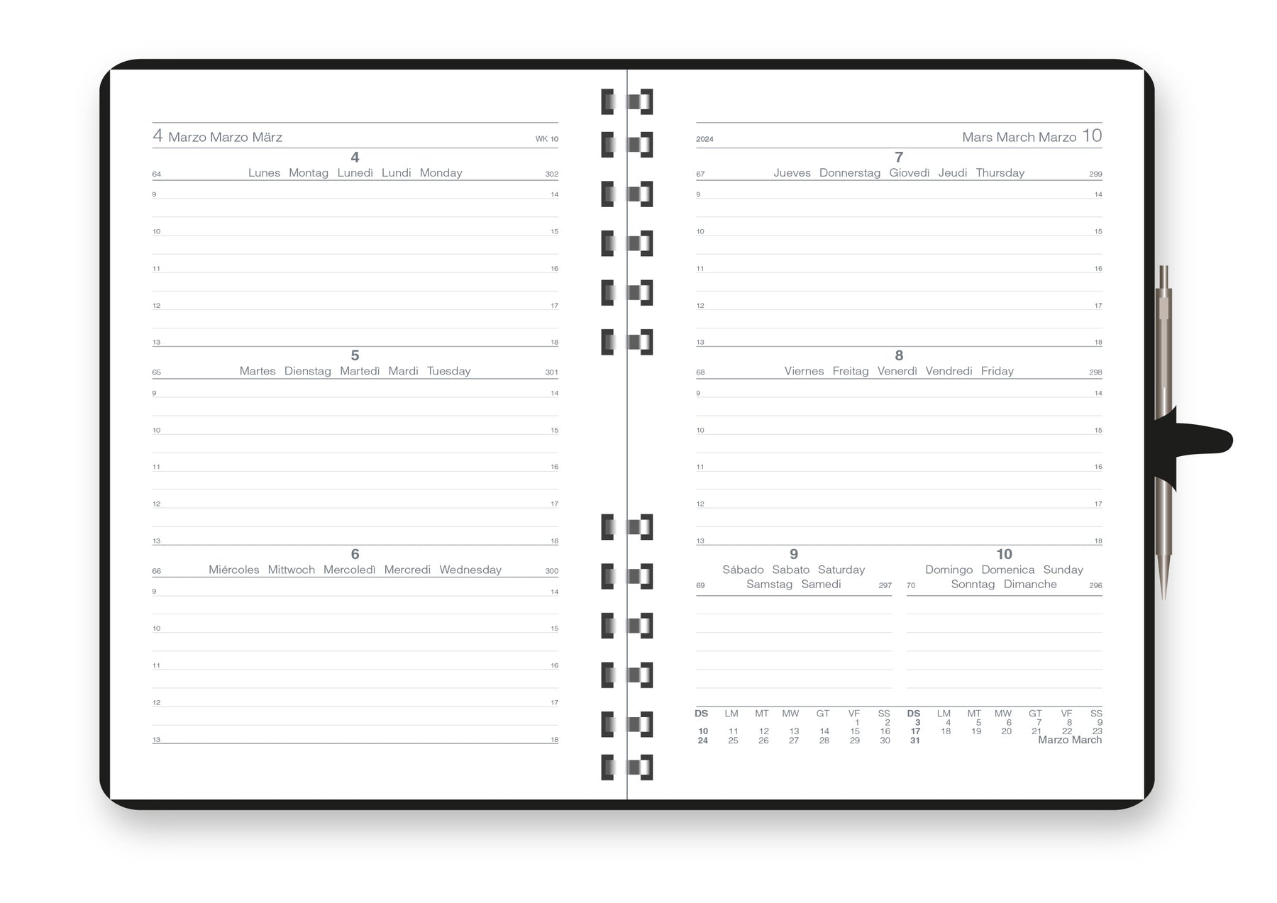 La copertina in cuoio rigenerato liscio di colore nero conferisce all'Agenda Settimanale Intempo Mood un aspetto professionale e sofisticato, ideale per l'ambiente lavorativo e non solo. Il formato 17x24 cm la rende comoda da trasportare e da utilizzare sulla scrivania, offrendo allo stesso tempo ampio spazio per annotare appuntamenti, scadenze e promemoria. La rilegatura a spirale, robusta e resistente, permette una facile apertura e chiusura dell'agenda, garantendo una scrittura agevole su ogni pagina. L'asta metallica assicura un aggancio sicuro del blocco, evitando che le pagine si stacchino accidentalmente.