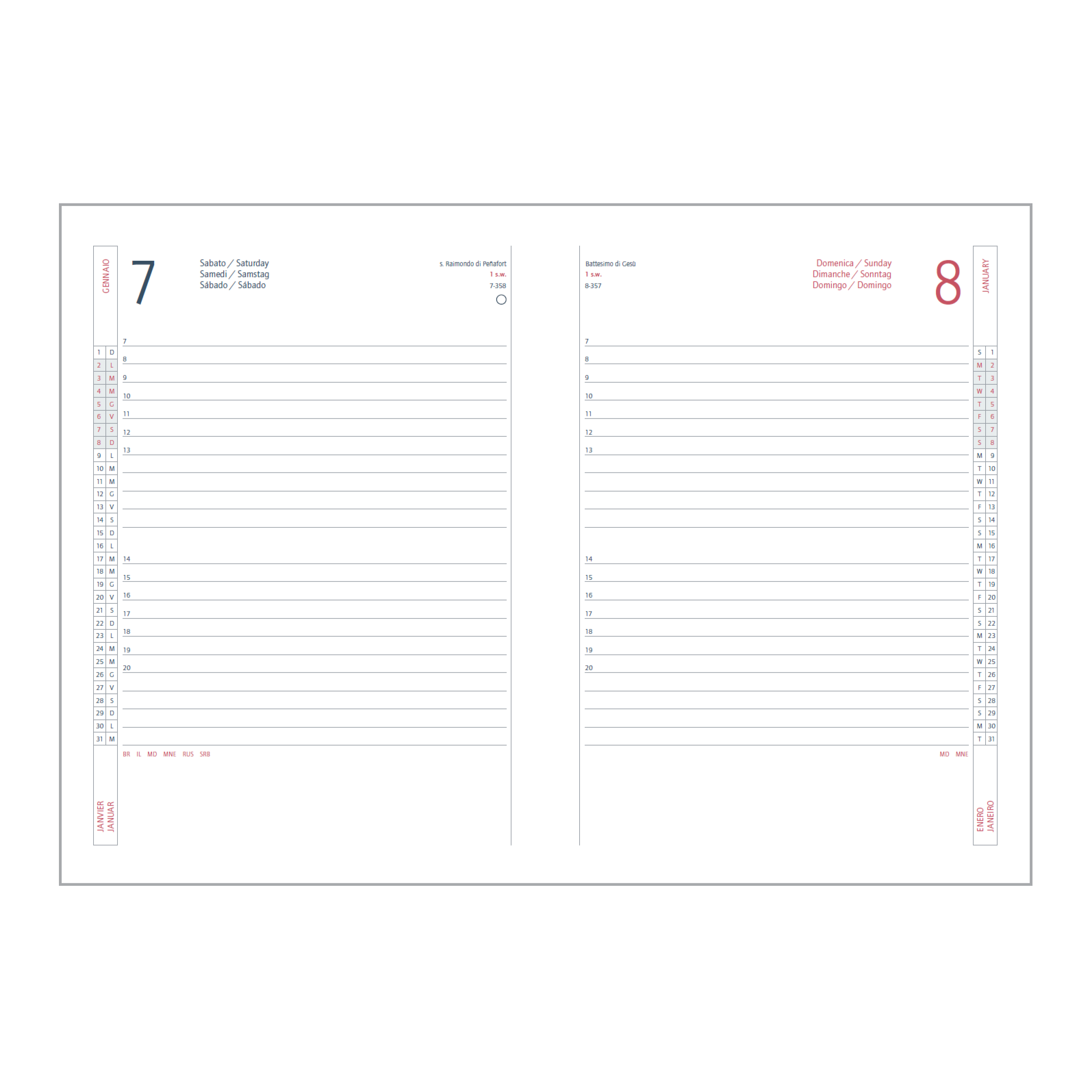 Una delle caratteristiche distintive dell'Agenda Giornaliera Intempo è la sua versatilità linguistica. I testi interni sono disponibili in italiano, inglese, francese, tedesco, spagnolo e portoghese, rendendola adatta a un pubblico internazionale. Che tu sia un professionista che collabora con colleghi stranieri, uno studente che studia all'estero o semplicemente una persona che ama viaggiare, questa agenda ti accompagnerà ovunque, facilitando la tua pianificazione in qualsiasi contesto.