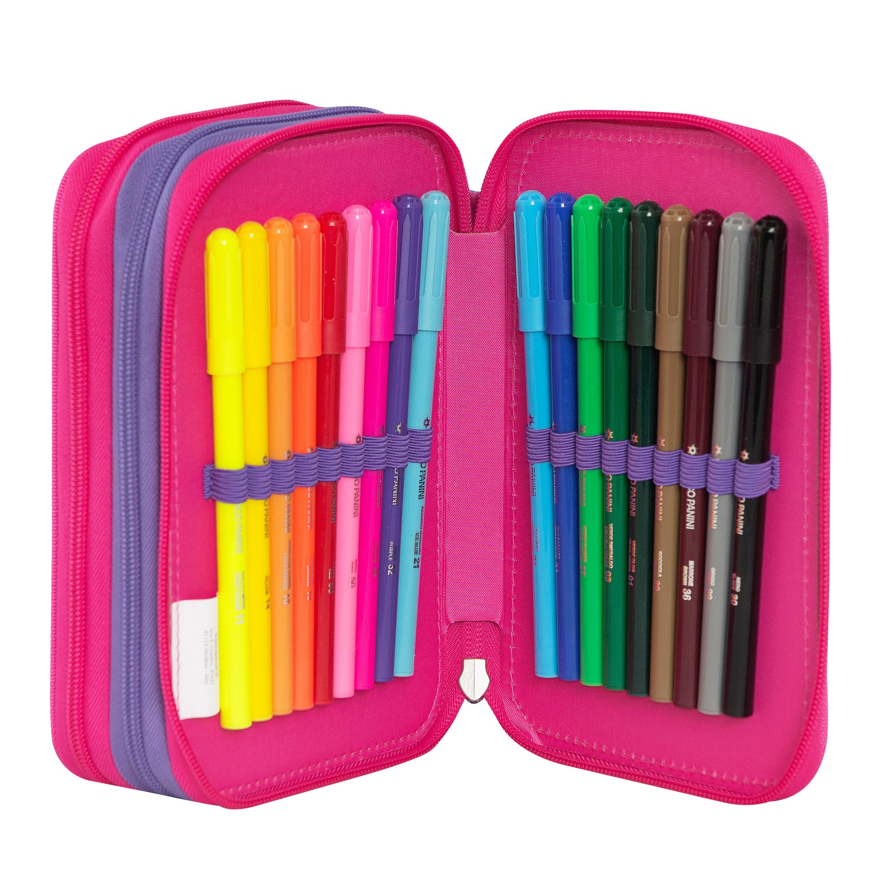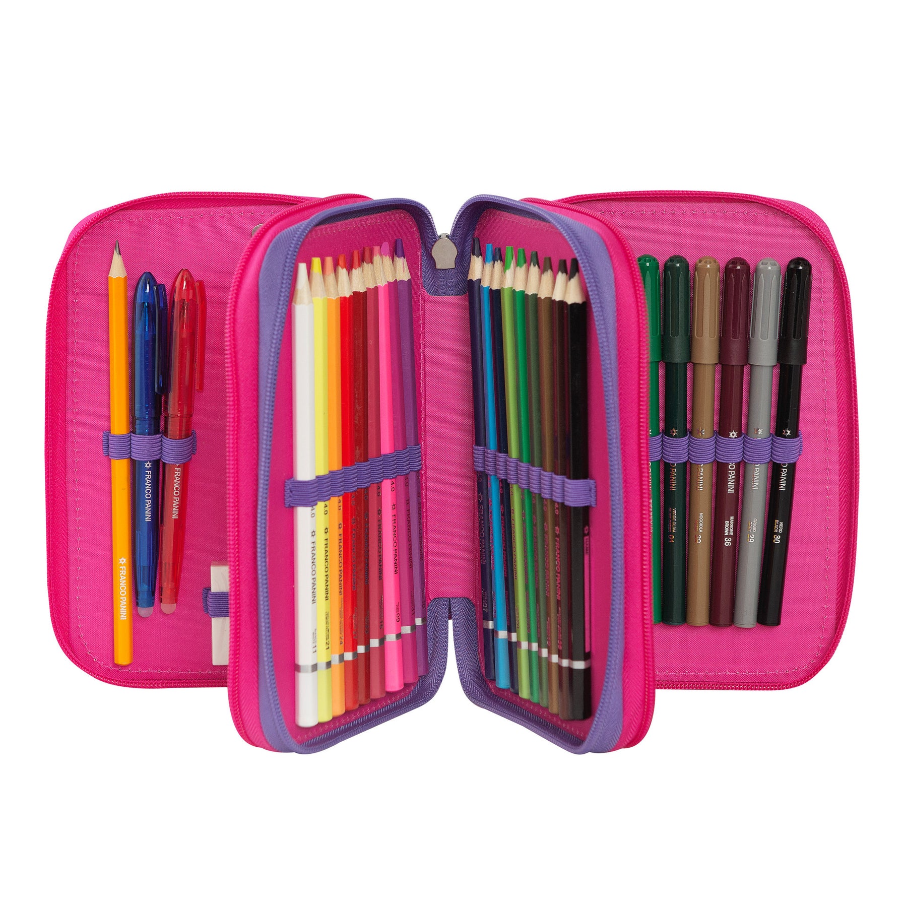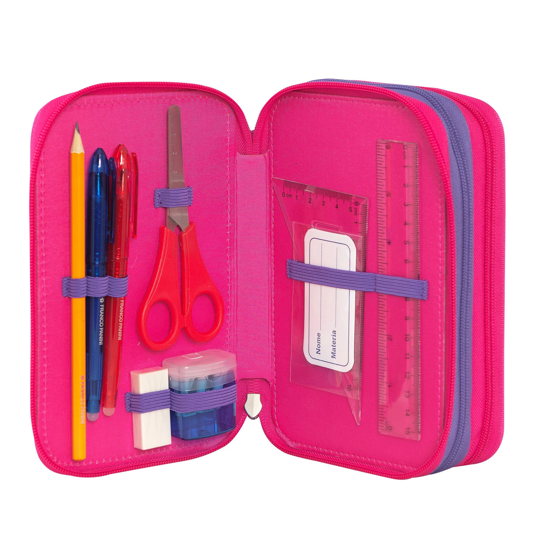 L'interno dell'astuccio è progettato per massimizzare lo spazio e l'organizzazione. I tre scomparti offrono ampio spazio per riporre in modo ordinato tutti gli strumenti necessari per la scuola. Questo sistema di organizzazione aiuta le studentesse a mantenere l'ordine e a trovare rapidamente ciò di cui hanno bisogno durante le lezioni.