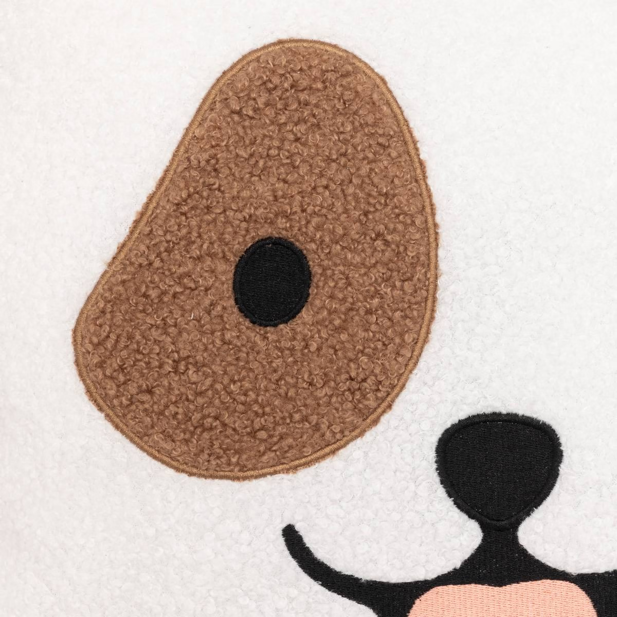 Il design del cuscino "Scott" è pensato per catturare l'attenzione e suscitare emozioni positive. La base in tessuto bouclé bianco conferisce un aspetto elegante e raffinato, mentre il ricamo a forma di cane aggiunge un tocco di originalità e simpatia. L'orecchio marrone in tessuto peloso è un dettaglio che fa la differenza, invitando i bambini ad accarezzarlo e a giocare con lui. Gli occhi e il naso ricamati in nero, insieme alla bocca rosa, creano un'espressione dolce e amichevole, che rassicura e infonde serenità.