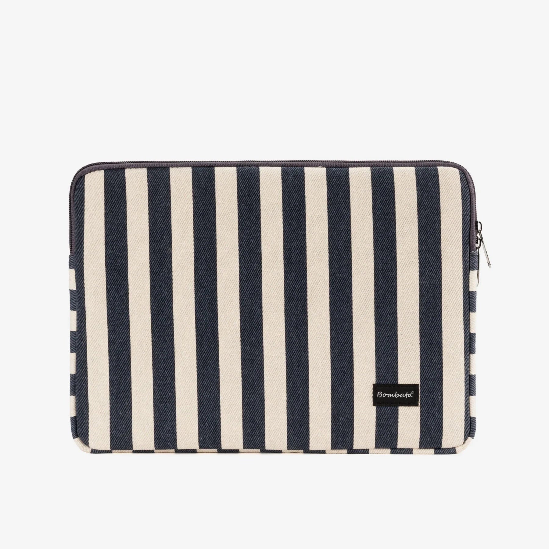 Il fascino della Bombata Versilia risiede nel suo design distintivo che celebra l'heritage italiano. Il motivo a strisce orizzontali blu e bianche richiama immediatamente l'atmosfera rilassata e sofisticata delle spiagge toscane, mentre il tessuto che riveste la custodia simula perfettamente il cotone dei tradizionali teli da mare. Questa scelta stilistica non è casuale: ogni volta che utilizzi questa custodia, porti con te un pezzo di quella dolce vita italiana che rende speciale ogni momento della giornata lavorativa. Il logo Bombata, discretamente posizionato sulla parte frontale, aggiunge un tocco di autenticità senza compromettere l'eleganza complessiva del design. La zip in metallo argentato completa l'estetica raffinata, unendo funzionalità e stile in un equilibrio perfetto che caratterizza il made in Italy di qualità.