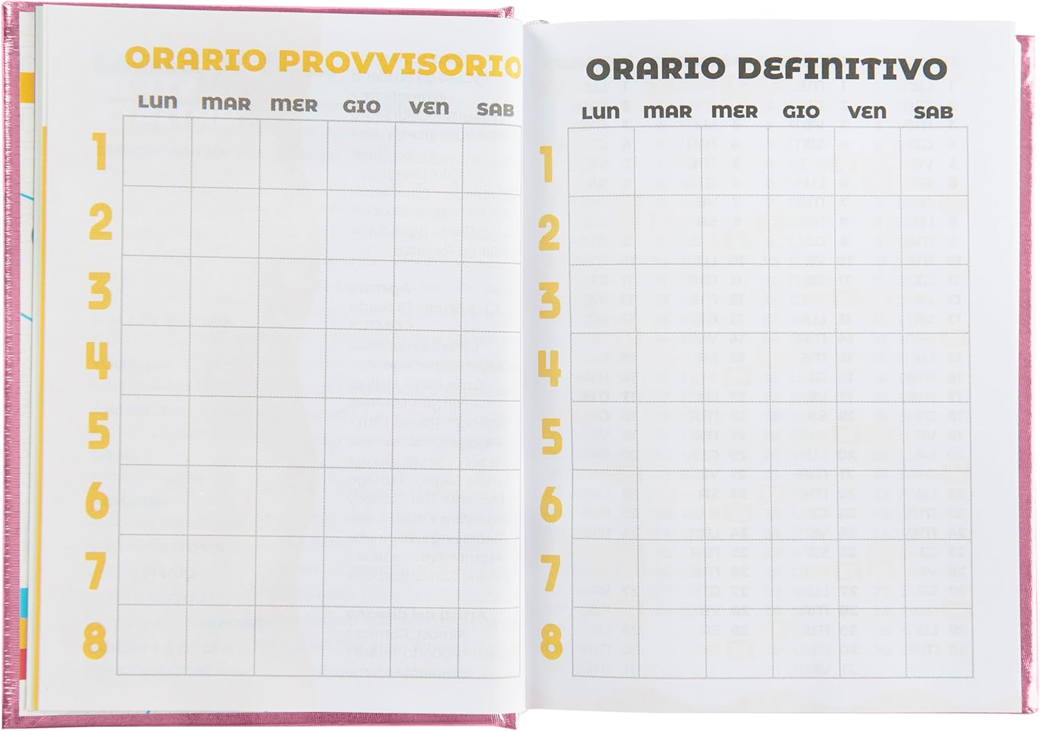 L'organizzazione interna dell'agenda è stata pensata per adattarsi alle esigenze degli studenti moderni. Include sezioni per la pianificazione a lungo termine, orari delle lezioni, spazi per annotare voti e medie, e pagine dedicate per progetti speciali o attività extracurriculari. Questa struttura completa ti aiuterà a mantenere un equilibrio tra impegni scolastici, attività personali e tempo libero.