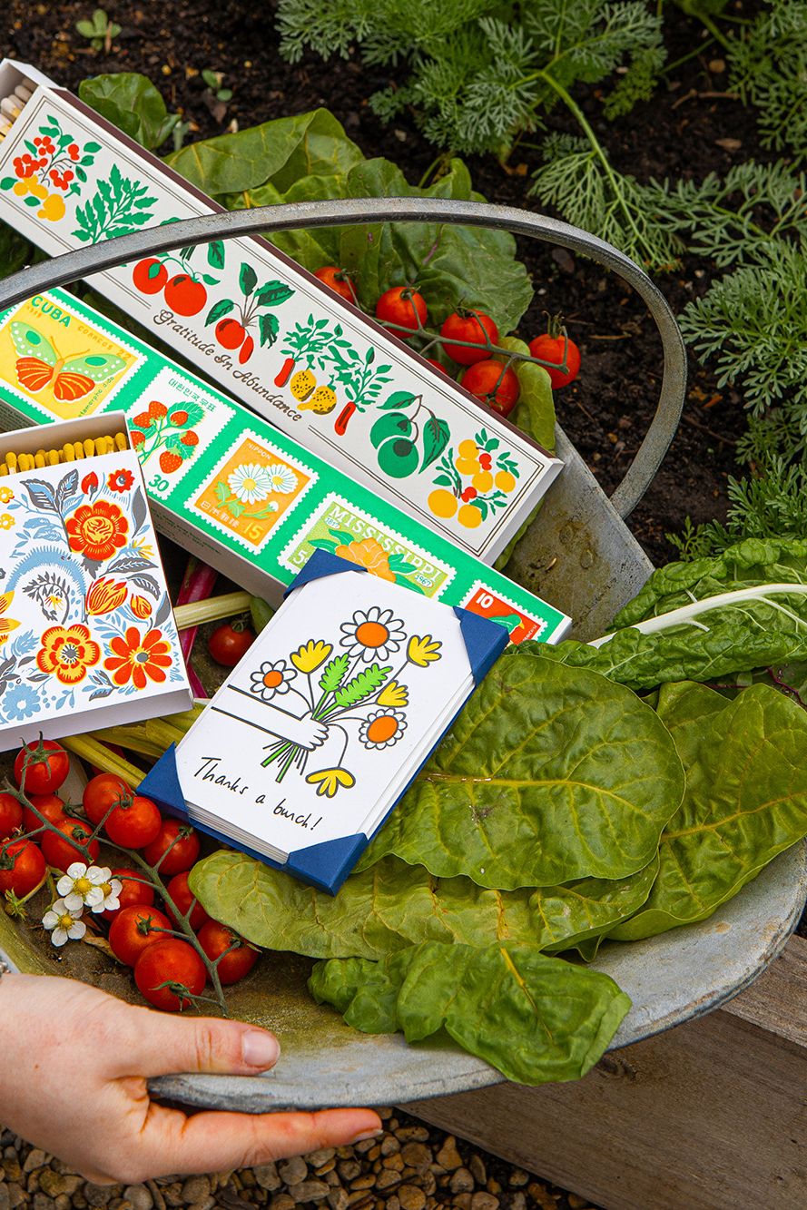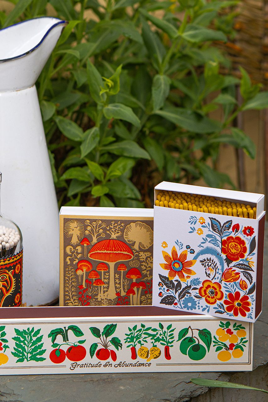 La scatola dei fiammiferi extra lunghi "Gratitudine in Abundanza" è un vero e proprio oggetto d'arte. Il design, con le sue tonalità terrose di verde, rosso e giallo, evoca la ricchezza della natura e la bellezza delle verdure stilizzate. La finitura opaca conferisce un aspetto elegante e naturale, mentre i fiammiferi in legno di alta qualità, con le punte bianche a contrasto, creano un'armonia visiva che cattura lo sguardo. Ogni elemento è studiato per riflettere il tuo gusto sofisticato e la tua attenzione ai dettagli.
