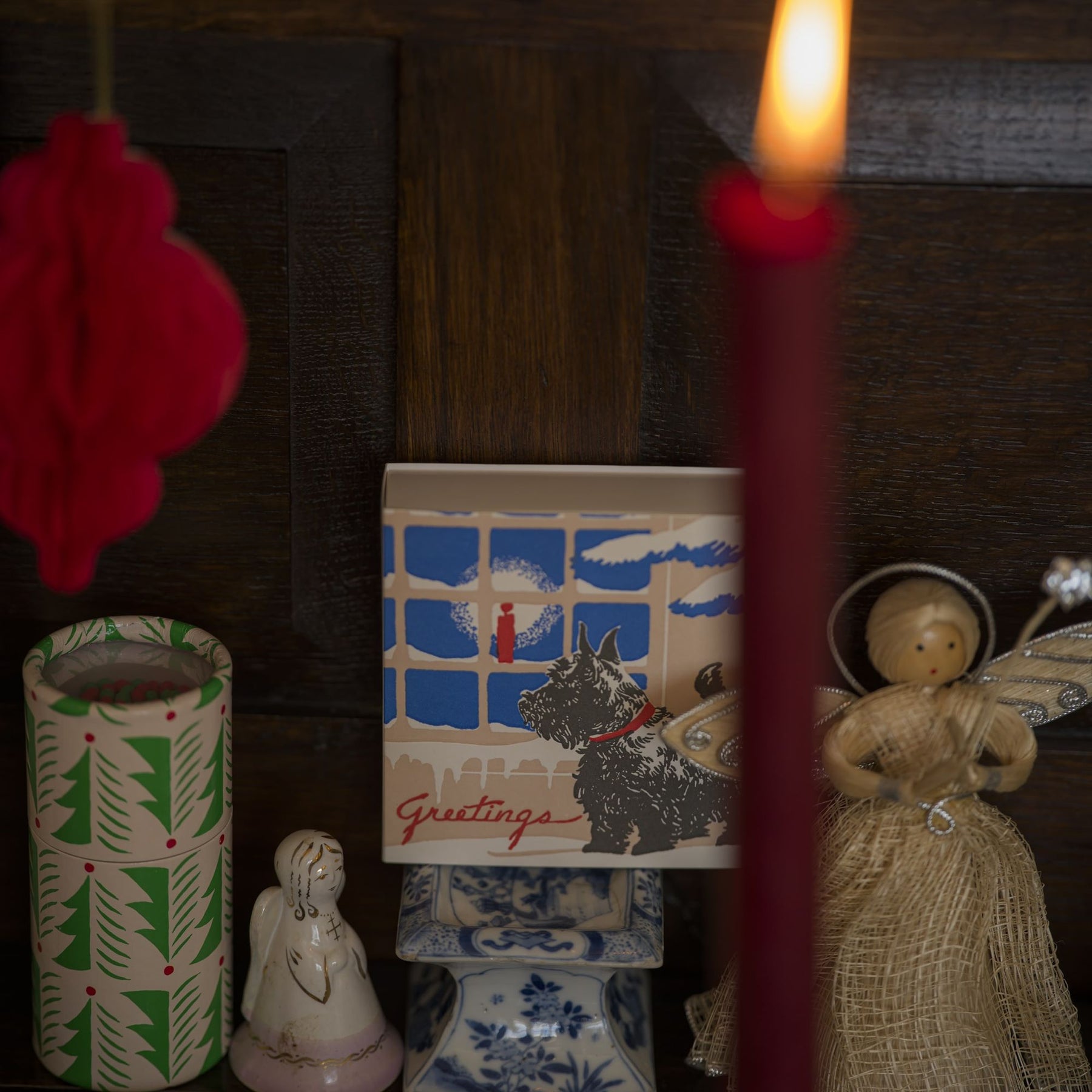 La scatola, splendidamente illustrata con un cane Scotty che osserva una candela accesa attraverso una finestra innevata, evoca ricordi d'infanzia e atmosfere accoglienti. È un accessorio che si integra perfettamente in qualsiasi stile d'arredamento, dal classico al moderno, aggiungendo un tocco di originalità e colore. Ogni scatola contiene ben 125 fiammiferi in legno, pronti a illuminare le tue serate e a creare un'atmosfera magica e suggestiva.