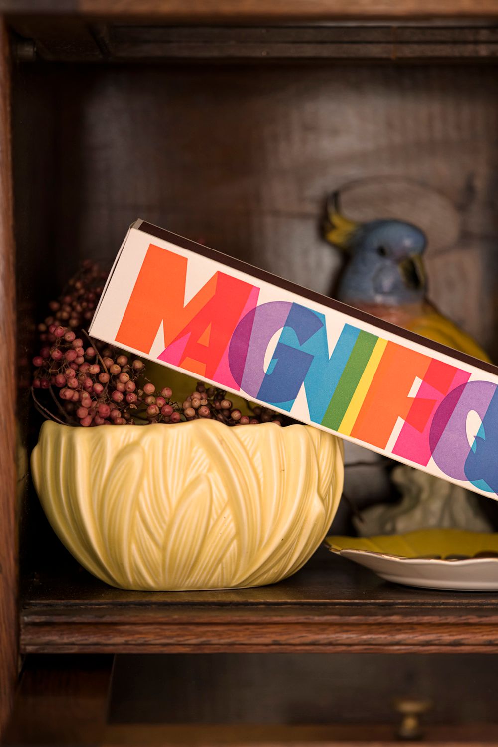 - Scatola con la parola 'Magnifique' stampata in caratteri grandi e multicolori