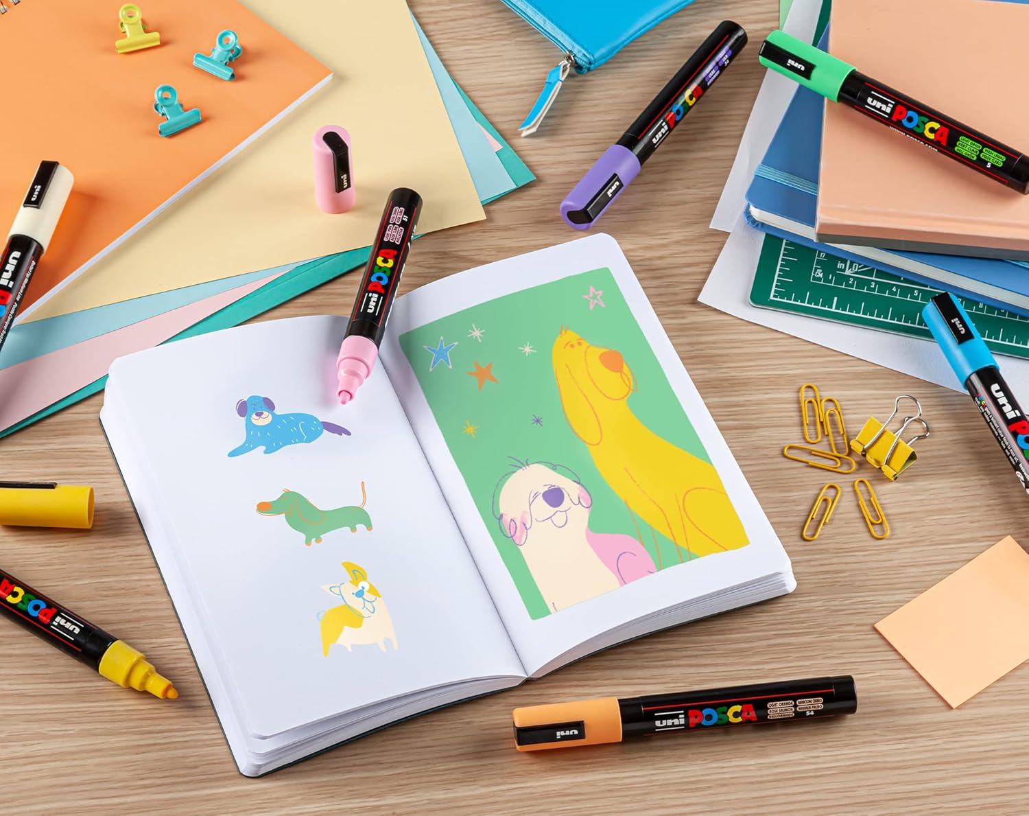 I pennarelli marcatore a tempera Uni Posca si distinguono per la loro punta media tonda con diametro variabile tra 1.8 e 2.5 mm, che garantisce un tratto preciso e controllato. L'inchiostro atossico a base d'acqua è formulato per offrire una copertura eccezionale e una resistenza duratura, sia all'acqua che alla luce.