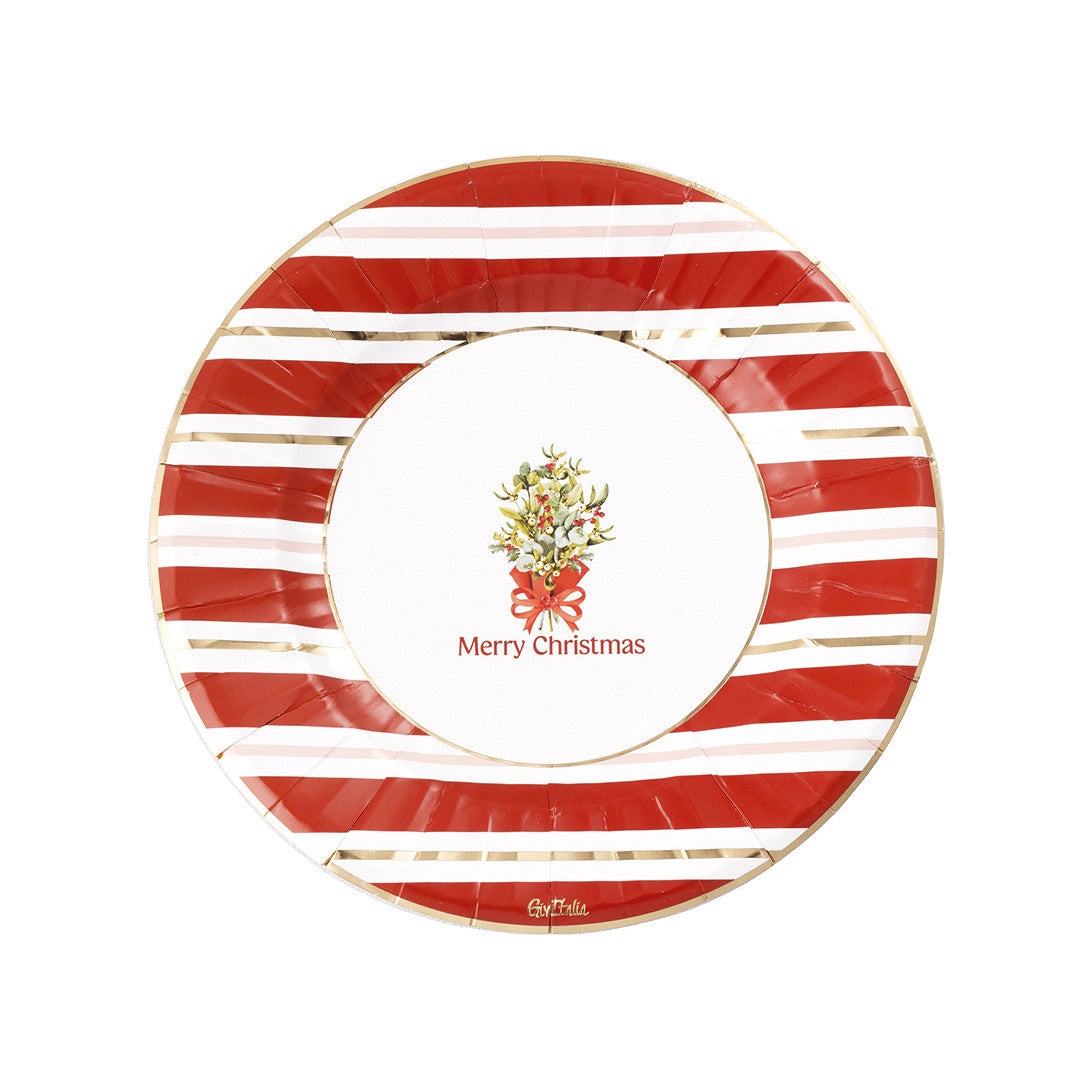 Il design distintivo combina sapientemente tradizione e modernità: il bordo decorato con righe rosse e dorate crea un effetto visivo dinamico ed elegante, mentre al centro la scritta "Merry Christmas" accompagnata da un raffinato bouquet di vischio e pungitopo aggiunge quel tocco di classe che rende ogni tavola speciale. Questi piatti di carta sono perfetti per chi vuole stupire i propri ospiti con una mise en place che sia al tempo stesso festosa, raffinata e instagrammabile.