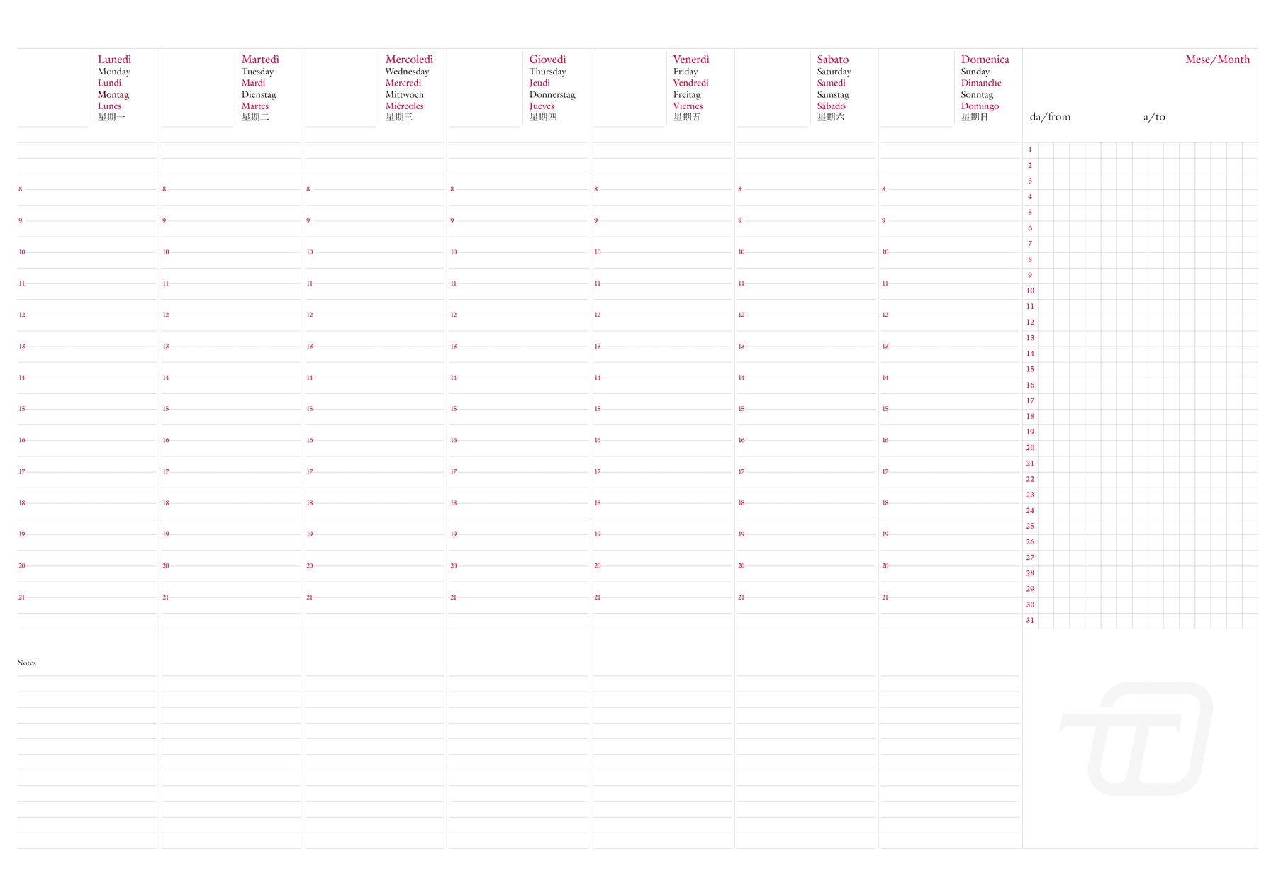 Questo Poliplan 50x35 è progettato per offrire la massima funzionalità. La sua struttura spiralata in metallo permette una facile apertura e chiusura, garantendo al contempo una stabilità ottimale. Ogni pagina è realizzata in carta bianca di alta qualità, con una disposizione verticale della settimana che facilita la lettura e la pianificazione. Gli spazi dedicati per le note accanto a ogni giorno ti permettono di annotare dettagli importanti e attività specifiche, tenendo tutto sotto controllo.