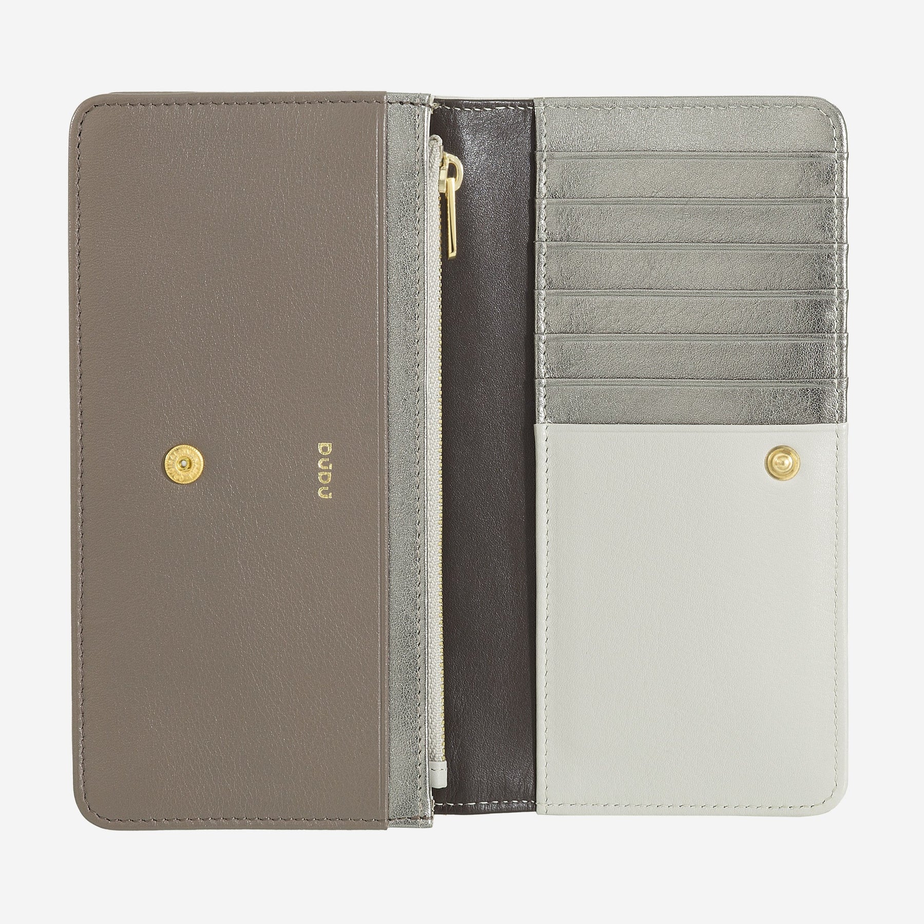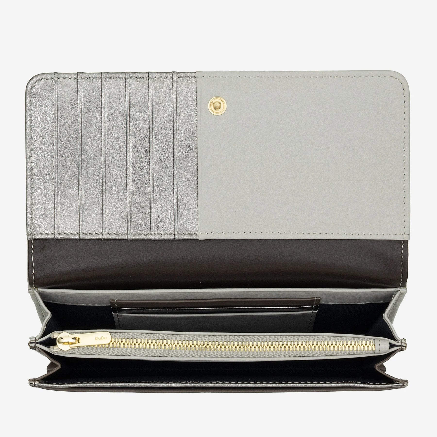 La pelle Nappa di vitello utilizzata per questo portafoglio Dudubags rappresenta il massimo della qualità nel settore pellettiero. La superficie liscia e setosa al tatto, combinata con la colorazione grigio perla, conferisce all'accessorio un'eleganza senza tempo che si adatta perfettamente sia a look professionali che casual. Il design a bustina con patta di chiusura a bottone garantisce non solo un aspetto sofisticato, ma anche la massima sicurezza per il contenuto. Le cuciture precise e i bordi perfettamente rifiniti testimoniano l'attenzione ai dettagli che contraddistingue il marchio DuDu®, mentre il logo discretamente impresso sulla parte frontale aggiunge un tocco di classe senza risultare invadente.