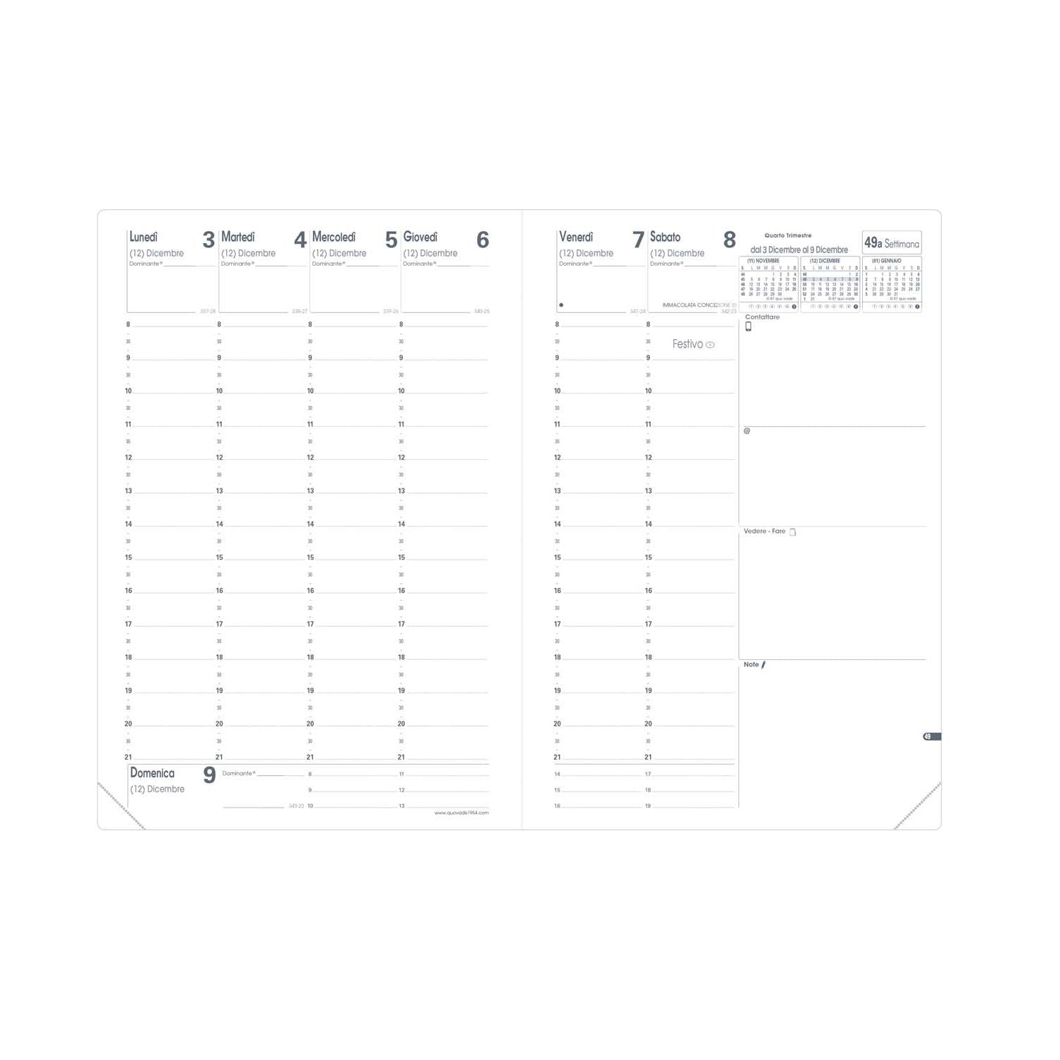 Ogni dettaglio della ricarica agenda Quo Vadis è stato studiato per offrirti la massima praticità. Gli angoli perforati rimovibili ti permettono di orientarti facilmente all'interno dell'agenda, consentendoti di trovare rapidamente la settimana che ti interessa. Questo piccolo accorgimento fa una grande differenza nell'utilizzo quotidiano, risparmiandoti tempo e frustrazioni. Inoltre, ogni doppia pagina è dotata di spazi dedicati per annotare promemoria e note, facilitando la pianificazione settimanale e aiutandoti a tenere traccia di tutte le tue attività. La fascia oraria, che va dalle 8:00 alle 21:00 o 23:00, con suddivisione degli appuntamenti ogni mezz'ora, ti offre una visione dettagliata della tua giornata, permettendoti di organizzare al meglio il tuo tempo.