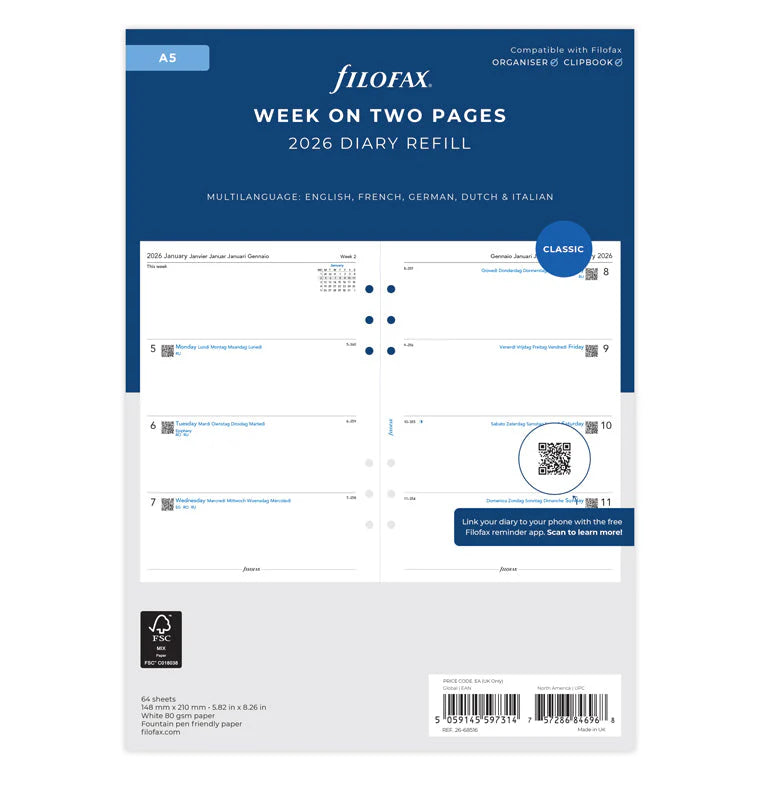 Questa ricarica settimanale A5 è perfetta per una vasta gamma di utenti, dai professionisti che necessitano di una pianificazione dettagliata delle loro attività lavorative, agli studenti che vogliono tenere traccia delle lezioni, degli esami e dei progetti. È anche un ottimo strumento per chiunque desideri semplicemente organizzare meglio la propria vita personale, gestendo appuntamenti, impegni e hobby. La sua versatilità e praticità la rendono adatta a qualsiasi stile di vita e a qualsiasi esigenza di pianificazione. Se cerchi un modo semplice ed efficace per migliorare la tua produttività e ridurre lo stress, la Filofax Ricarica Agenda Settimanale A5 2026 è la scelta giusta per te. Scopri come questo piccolo accessorio può fare una grande differenza nella tua vita quotidiana.