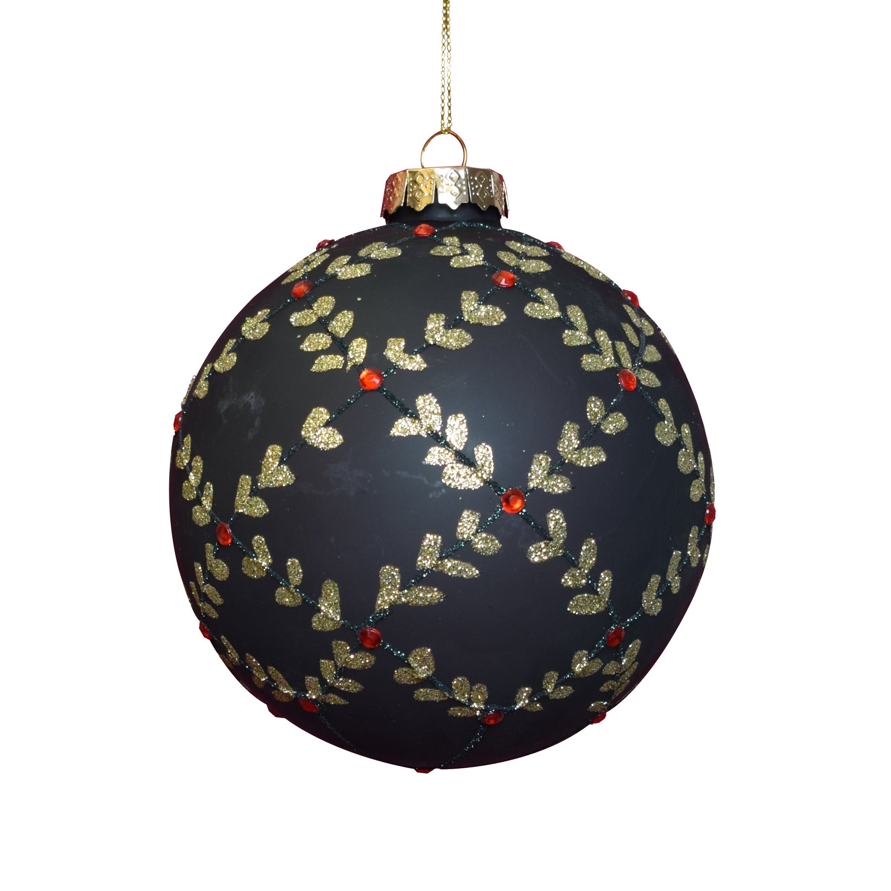 Le foglie verdi finemente stilizzate, arricchite da dettagli dorati, danzano sulla superficie della sfera, creando un affascinante gioco di luci e ombre. Il verde intenso del vetro, combinato con le delicate perline rosse, evoca l'essenza stessa del periodo natalizio, regalando un'atmosfera calda e accogliente.