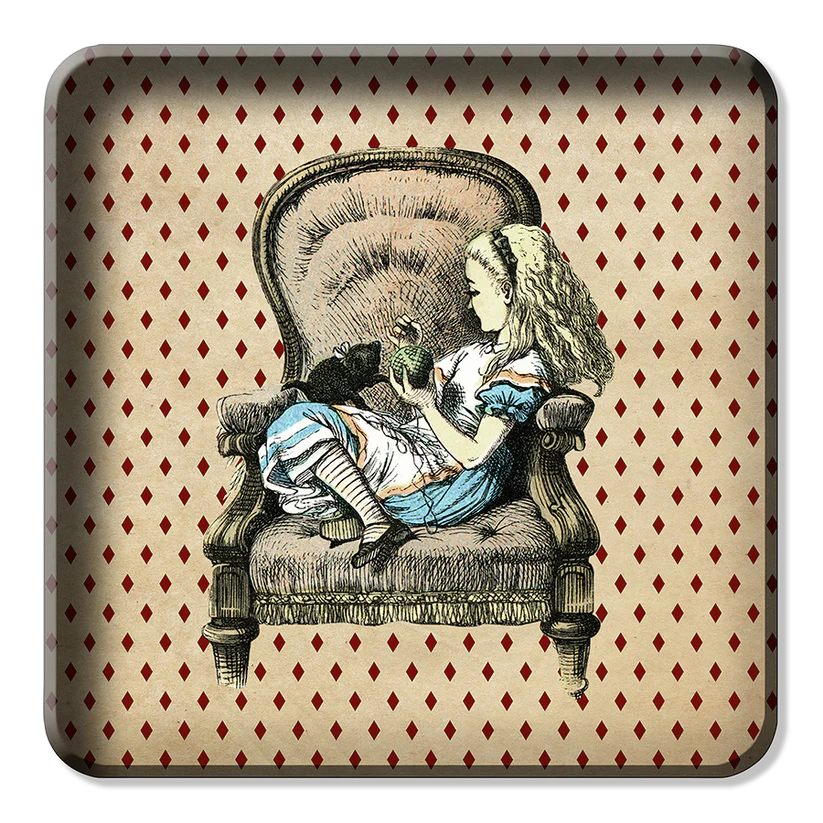 Il design del Blue Shaker Svuotatasche Alice è un omaggio al classico di Lewis Carroll, con illustrazioni vintage che evocano l'atmosfera incantata del Paese delle Meraviglie. La base beige chiaro, decorata con un motivo a rombi rossi, crea un contrasto vivace e accattivante, mentre l'immagine di Alice seduta su una poltrona aggiunge un tocco di eleganza e raffinatezza. Ogni dettaglio è curato con attenzione, dalla qualità della stampa alla finitura liscia e lucida del metallo verniciato. Questo svuotatasche non è solo un oggetto utile, ma un piccolo capolavoro che arreda con gusto e personalità.