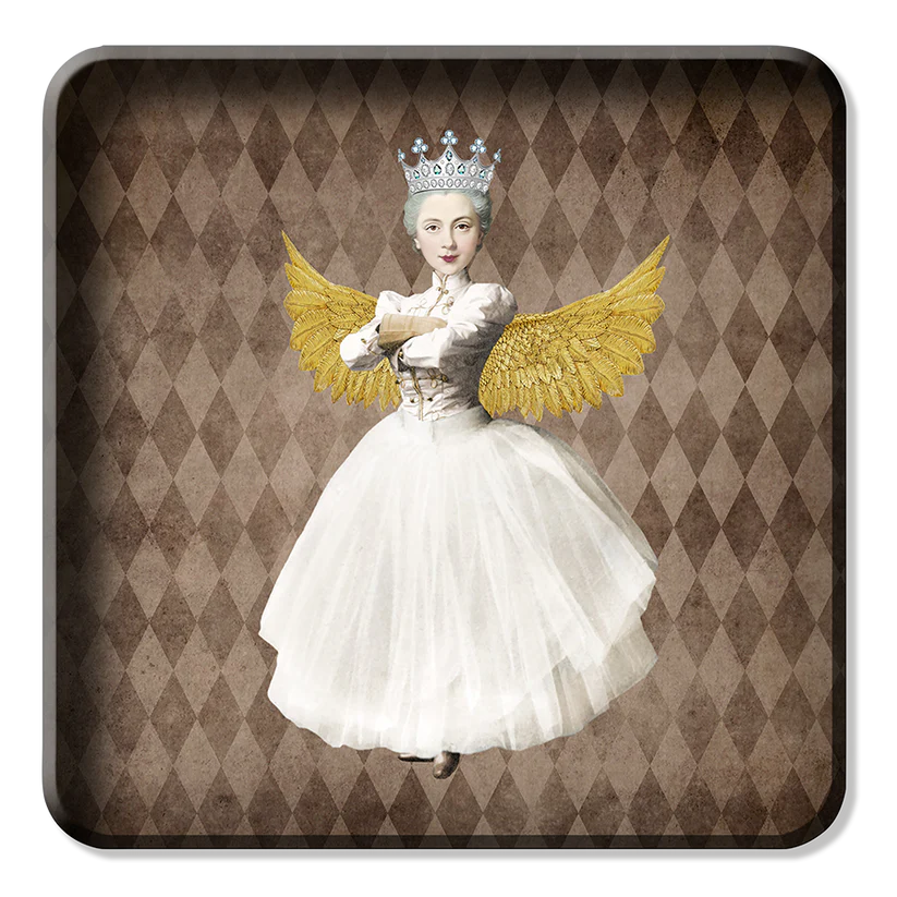 Il design del Blue Shaker Svuotatasche Metallo Golden Princess Vintage Quadrato 15x15 cm è un omaggio all'estetica vintage, reinterpretata in chiave moderna. Le illustrazioni raffigurano una figura femminile con ali dorate, un dettaglio che aggiunge un tocco di fantasia e originalità al prodotto. Il fondo marrone crea un contrasto armonioso con le immagini, esaltandone i colori e i dettagli. La superficie in metallo verniciato conferisce al vassoio una finitura liscia e lucida, piacevole al tatto e facile da pulire. Il bordo leggermente rialzato impedisce agli oggetti di scivolare via, garantendo una maggiore sicurezza e praticità d'uso.