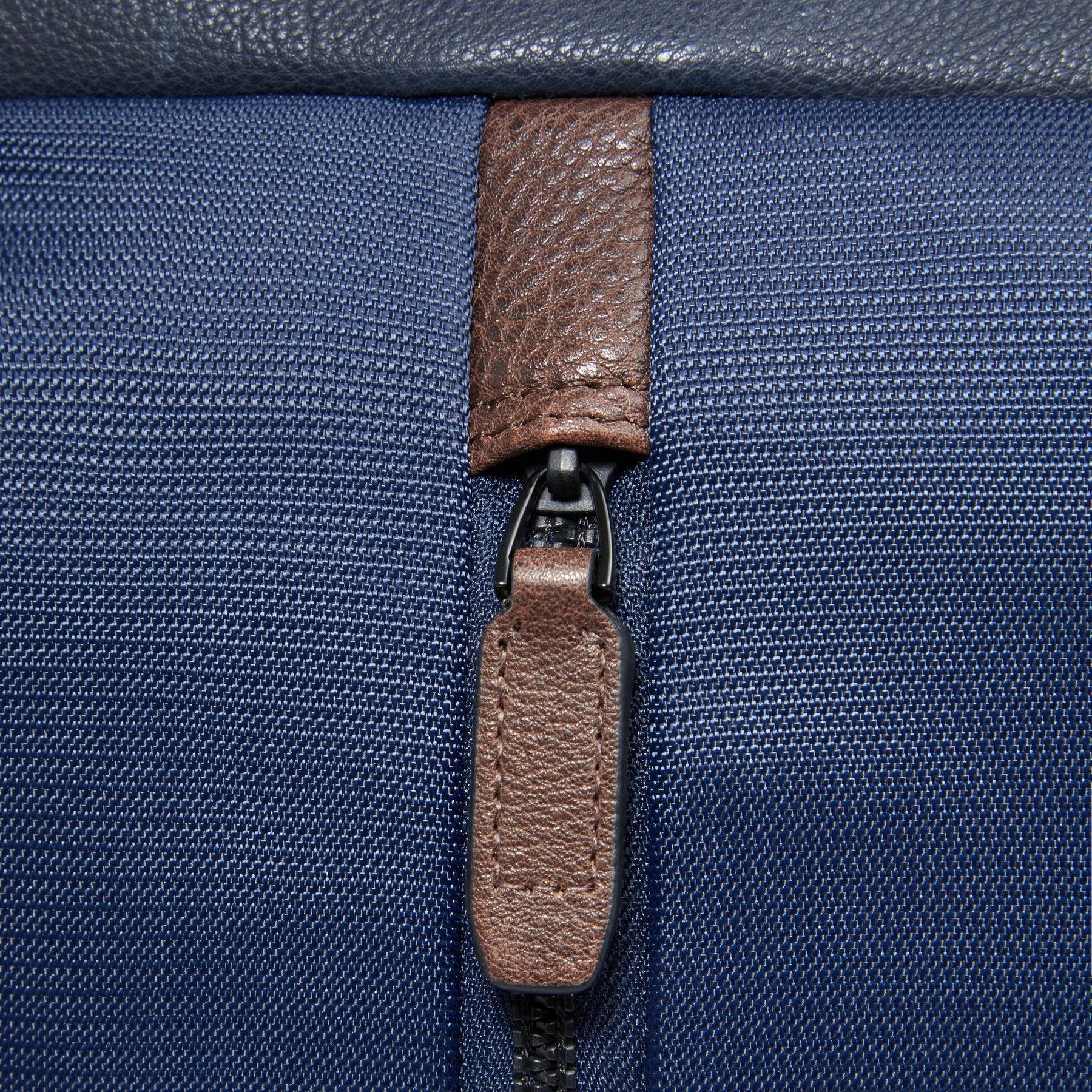 Il design dello zaino Piquadro Marcel è caratterizzato da un'estetica pulita e sofisticata, dove il blu profondo del tessuto si sposa armoniosamente con i dettagli in testa di moro. La texture leggermente strutturata del tessuto crea un piacevole contrasto visivo con la pelle di vitello pieno fiore, utilizzata per il fondo e i dettagli, che presenta una grana naturale e un effetto nuvolato, testimonianza dell'artigianalità e della qualità dei materiali impiegati.
