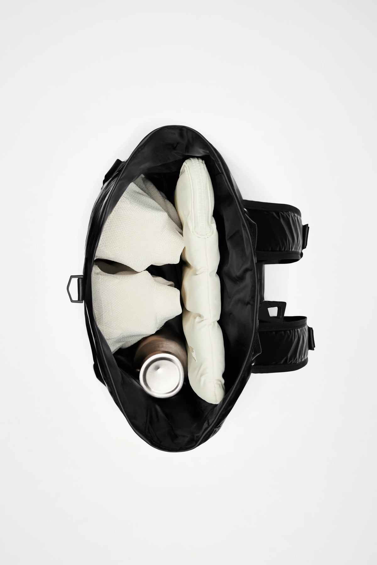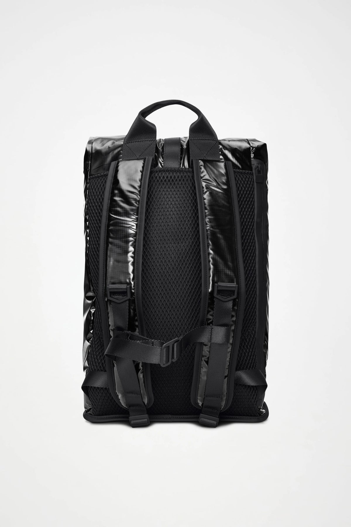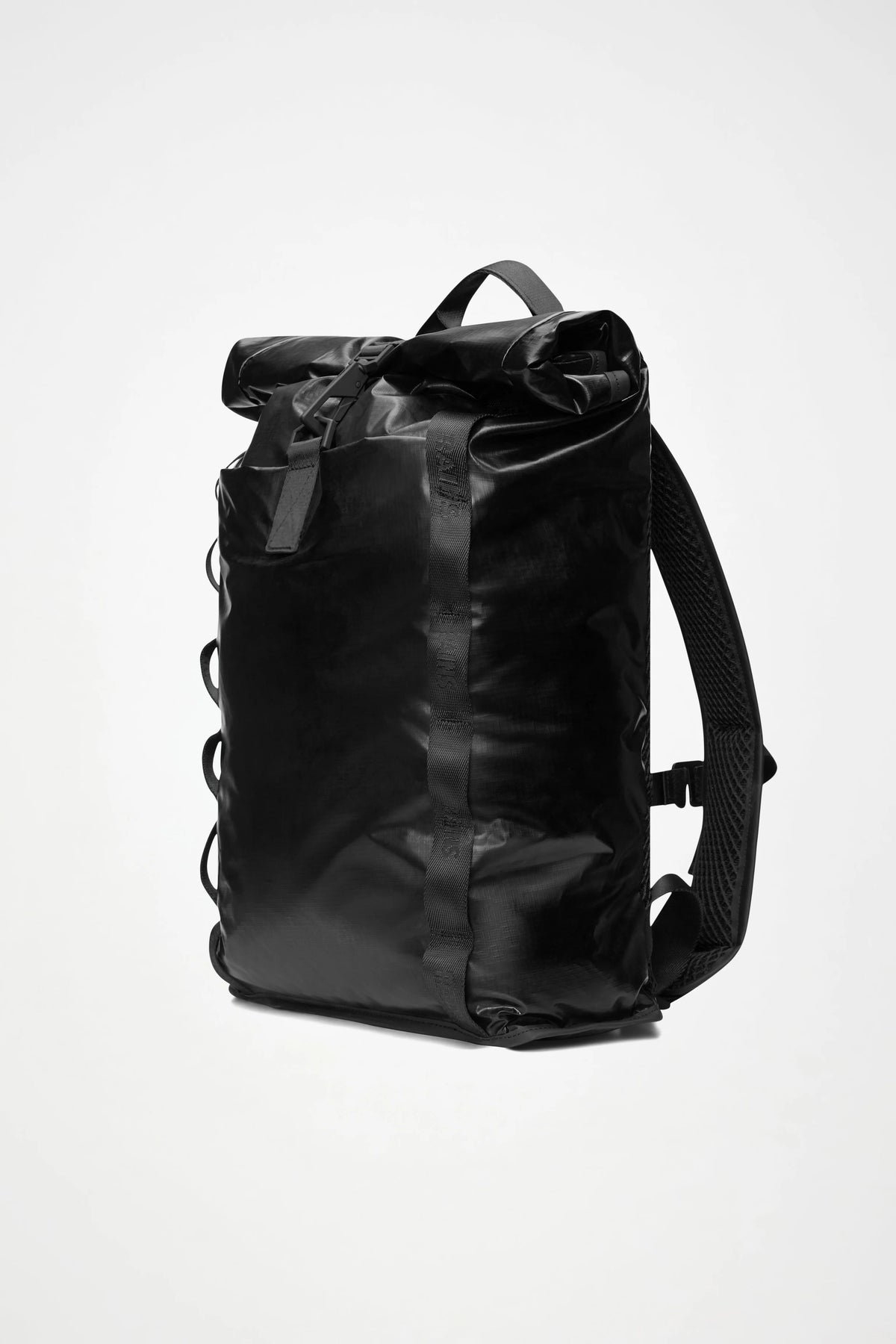 Le finiture in tessuto jacquard con logo e i dettagli costruttivi curati nei minimi particolari testimoniano l'attenzione del brand RAINS per la qualità e l'estetica. Le cinghie di compressione regolabili permettono di ottimizzare il carico e mantenere stabile il contenuto durante il movimento, mentre i passanti portaoggetti in nastro offrono ulteriori possibilità di personalizzazione e trasporto di accessori esterni.
