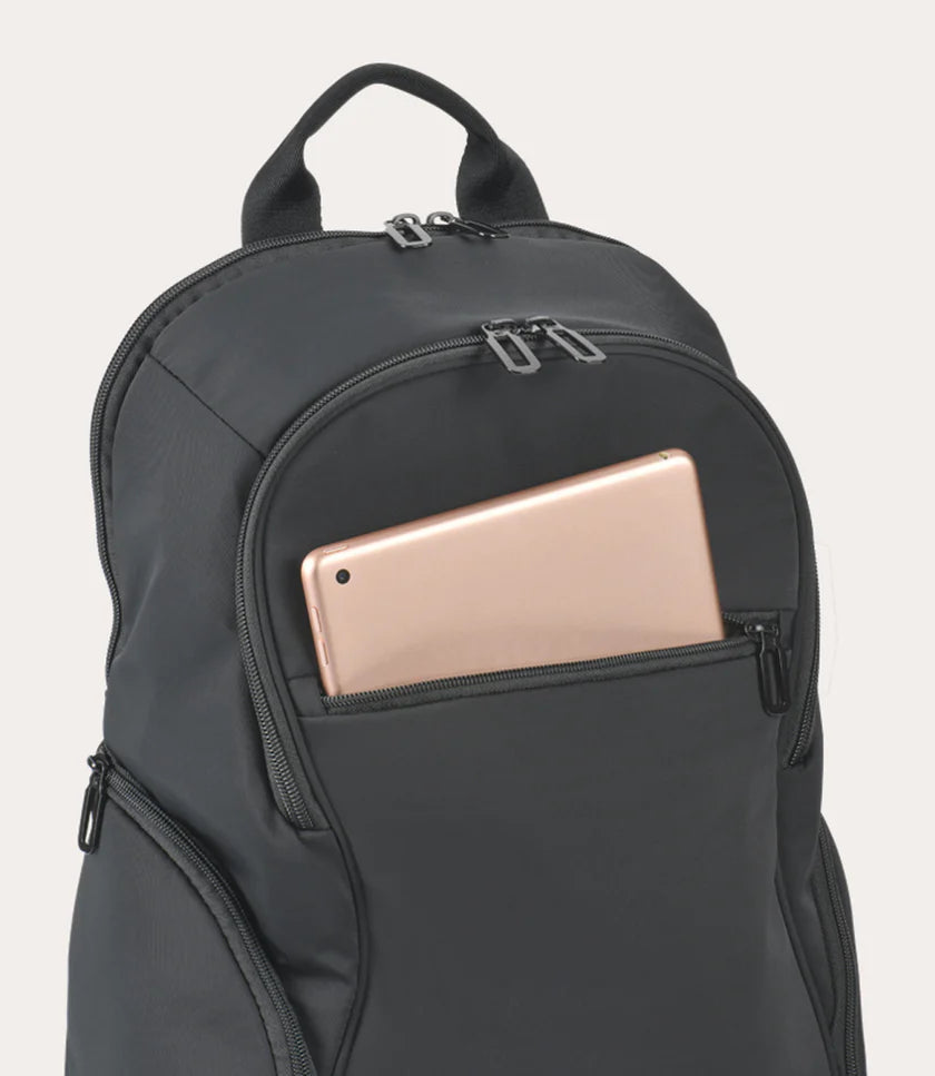 Le due tasche frontali offrono accesso rapido a smartphone, biglietti da visita, penne e piccoli accessori, mentre le tasche laterali sono perfette per bottiglie d'acqua o ombrelli. La tasca di sicurezza sul retro rappresenta un valore aggiunto fondamentale per chi viaggia frequentemente, permettendo di custodire documenti importanti, passaporti o portafogli in totale sicurezza, protetti dal contatto diretto con l'esterno.